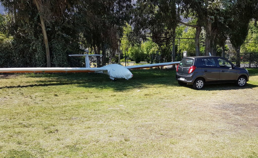 Walther und ich beginnen meinen Rumpf herauszunehmen, das ist leider nicht so einfach weil der Container ungünstig steht, will heissen ein Tor lässt sich nicht ganz öffnen. Nach einigem Üben kommt noch Jan dazu, er fliegt den Ventus. Mit vereinten Kräften schaffen wir diese erste Hürde, dann die weiteren. Nach gut zwei Stunden steht die DG montiert da. Es scheinen keine gröberen Schäden zu geben, zum Glück.